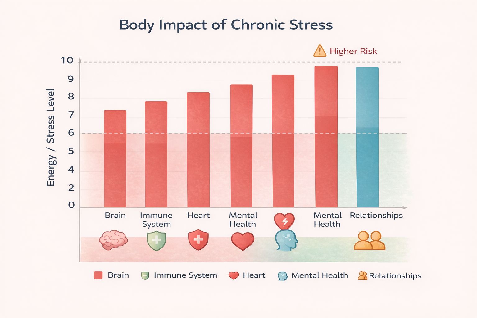 Chronic stress isn't just uncomfortable—it's actively rewiring your brain and body. When you're under constant pressure, your body pumps out cortisol like it's going out of style. Over time, this leads to: